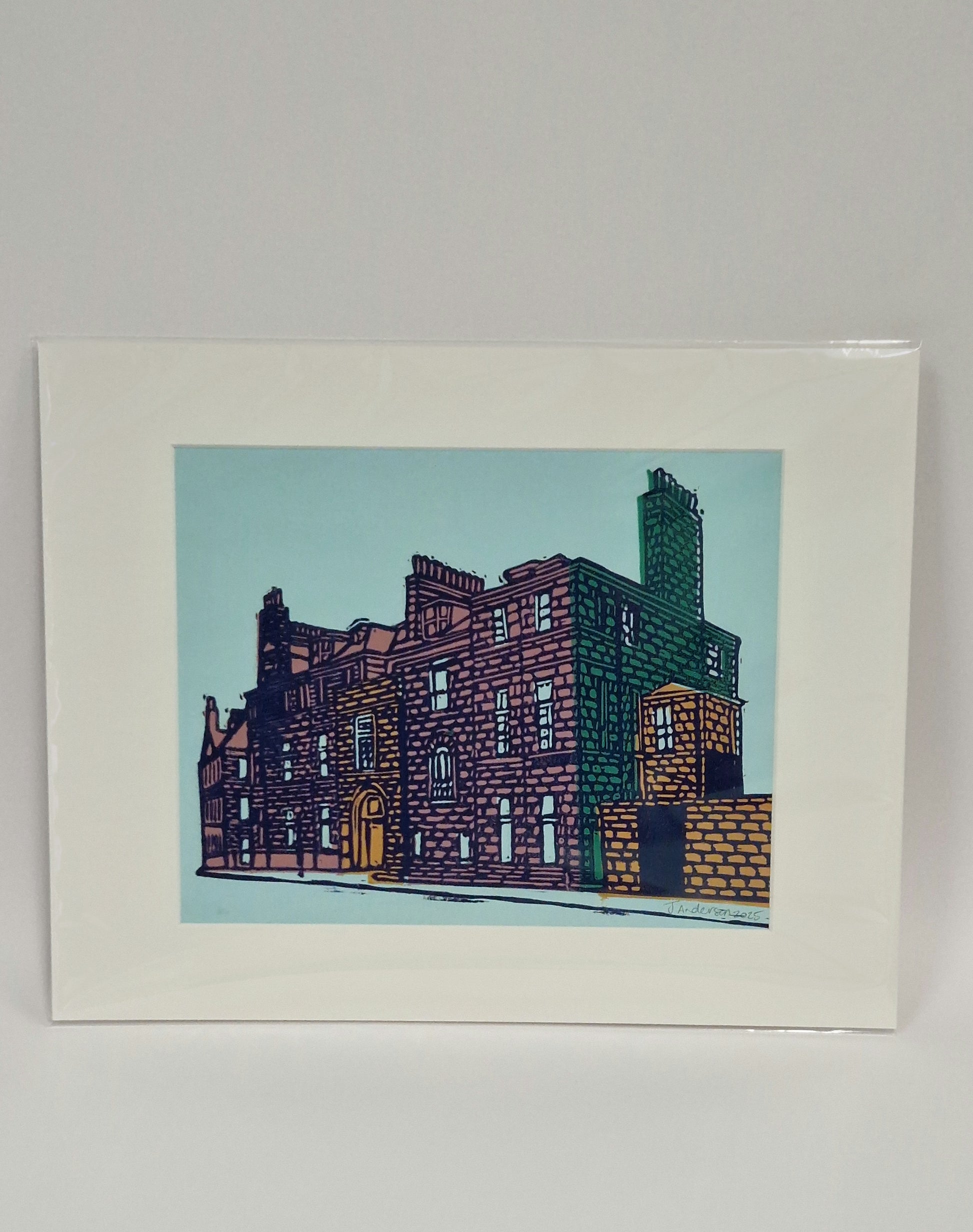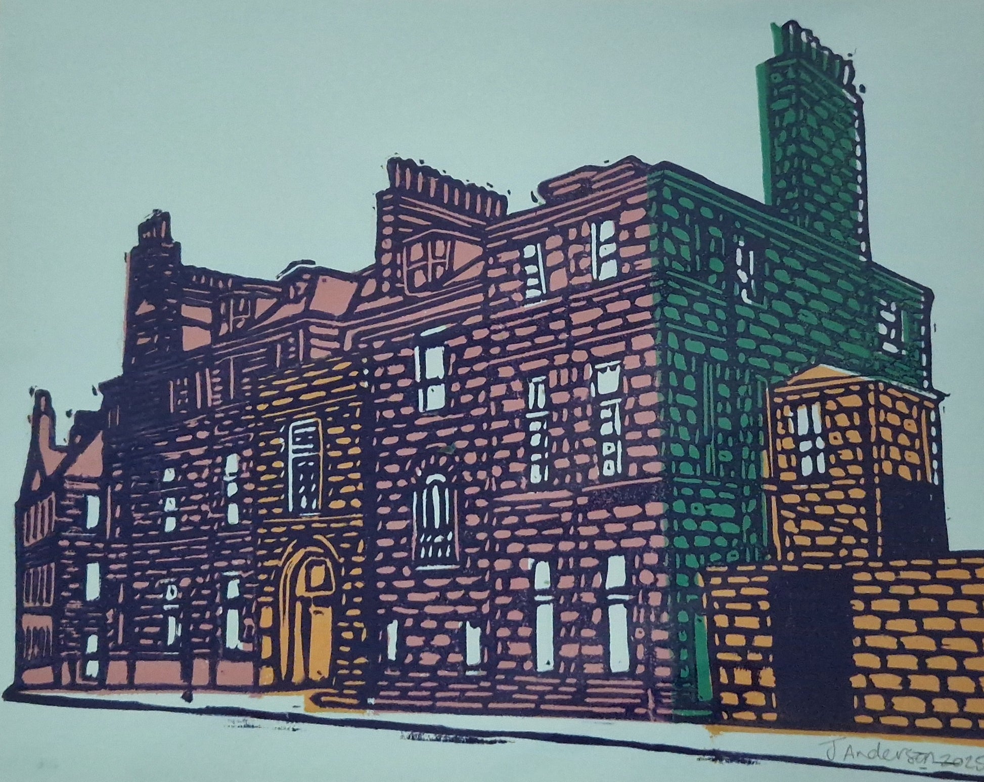 This original lino print is printed using the jigsaw printing method, where a lino block is cut into individual blocks or shapes. These blocks or shapes are then individually inked in different colours. The "jigsaw" is then put together and printed. A block with the detail is then printed over the coloured print.Β