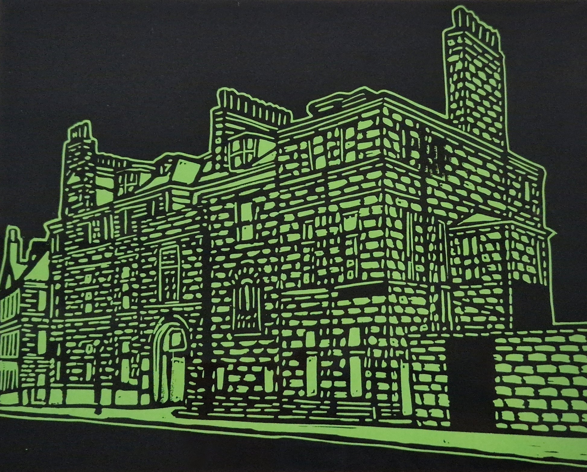 This original lino print is one of a kind, the only one printed full block black on green paper, before I decided to cut away the sky! Came back to this thinking I should have printed more before cutting, happens sometimes. There are a few colour variants of this, black ink on different coloured papers.Β